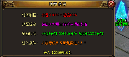 首先我们要知道这个地图刷新那些怪物,这些怪物的刷新时间,第一批刷新的怪物为:巅峰小鬼、这种怪物刷新的最快每隔5分钟刷新一波,每次刷新100只。巅峰小鬼的爆率为:材料、元宝、积分等等主要以这些为主。