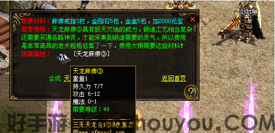 这把是附加维修装备功能的,只要你带着这把,可以说你在游戏里面永远久不需要维修装备,在里面维修装备,也是需要大量的金币跟元宝,咱们只要拥有这个,就可以节省很多的金币跟元宝