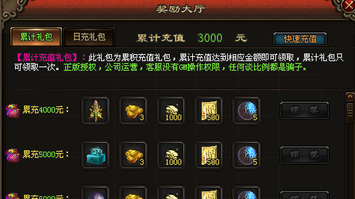 对于累计充值的玩家在手游版本里面因为游戏的不同,领取到的东西也是不一样的,在这里我还要给大家说一下,玩家在领取这些东西的时候,一定要按照顺序去领取,比如说充值啦500块钱,玩家应该从最少开始领取,玩家一定要注意这件事情。