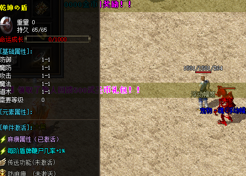 不仅这件乾坤盾有麻痹属性,还有防止麻痹属性,也就是说只要激活这件装备,不用担心在被对手麻痹住,要想激活这个属性,需要的材料有点多,有天心碎片+500元宝+祖玛头像+号角这些材料,才能激活防麻痹属性,而这些材料商铺不,玩家只能通过怪物获得。