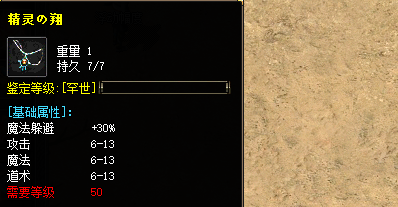 如上游戏截图所示,这件装备在魔法躲避上面+30%躲避属性,也就是说穿戴上这件装备以后可以更好的躲避掉对手的技能,在攻击魔法还有道术上面是6-13点属性点,需要穿戴等级为50等级。