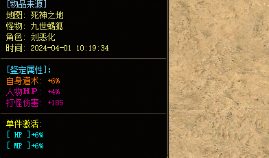 对于这件装备还有单件属性(如下图1)可以看到在自身道术上面+6%,在任务HP上面+4%在打怪伤害上面+185点伤害增加,还激活了6%生命值增加。